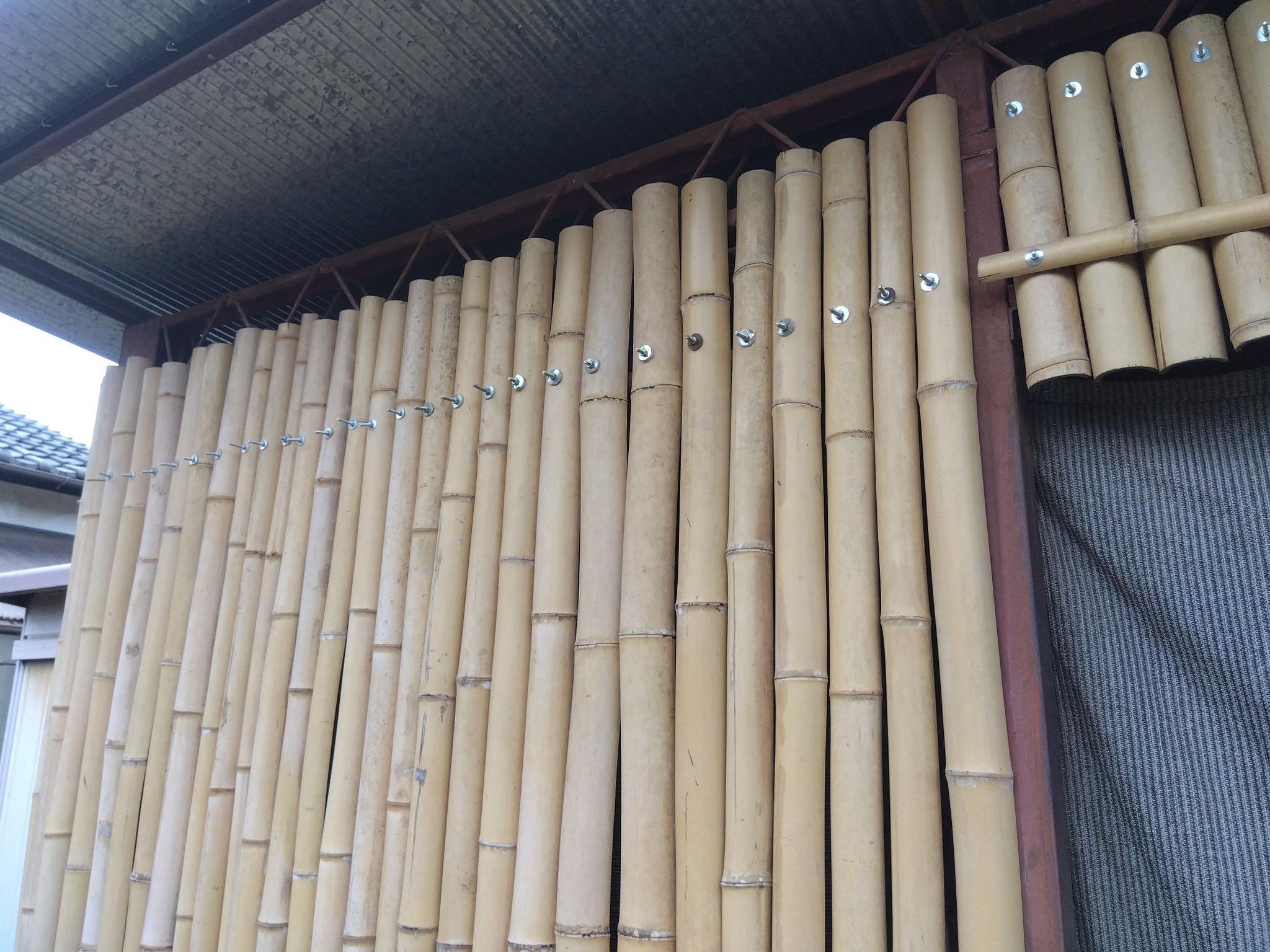 んじゃ、下手クソでも何でもいいから、やってみりゃいいじやん、ということで、一昨年、竹を切り出して、庭先の小屋の壁を竹で張り直してみた。(写真)